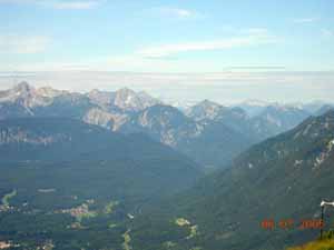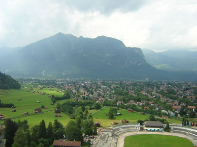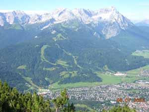 die umliegenden Alpen und auf Garmisch und Partenkirchen unten im Tal.