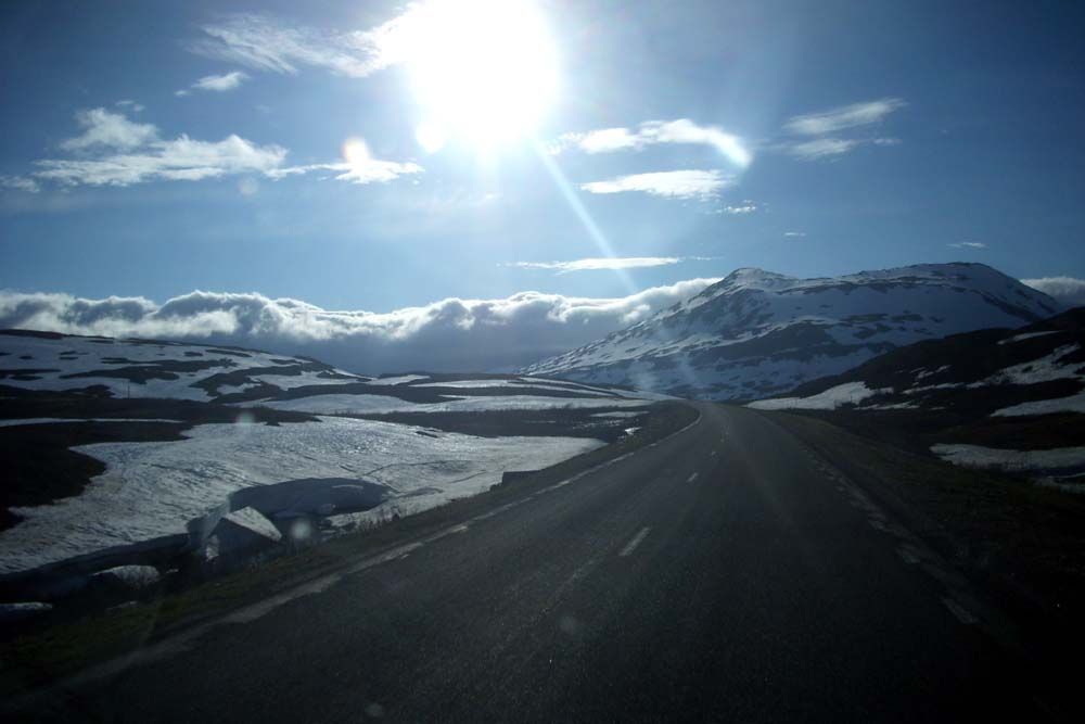 Kurz vor 19.°° Uhr kommt endlich die Sonne raus. Wir sind immer noch auf der kleinen S95 (unbedingt empfehlenwert!!!) unterwegs und die ersten schneebedeckten norwegischen Berge sind in Sichtweite.