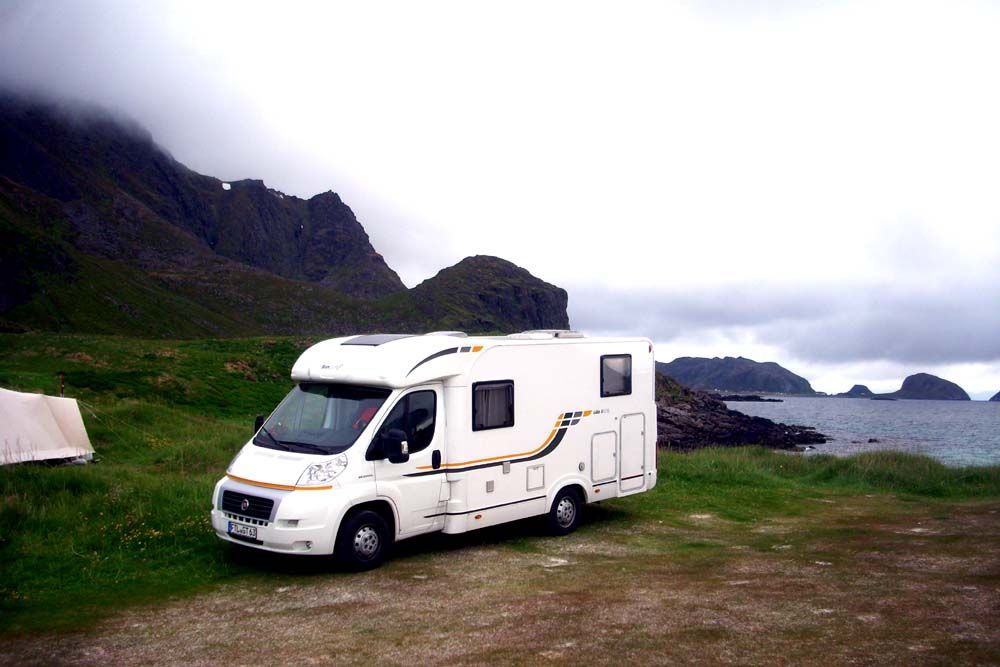 Nachdem sich die Hunde am Strand ausgetobt haben, fahren wir auf der E10 weiter nach Eggum, dort soll es einen Stellplatz mit Mitternachtssonnenblick geben.