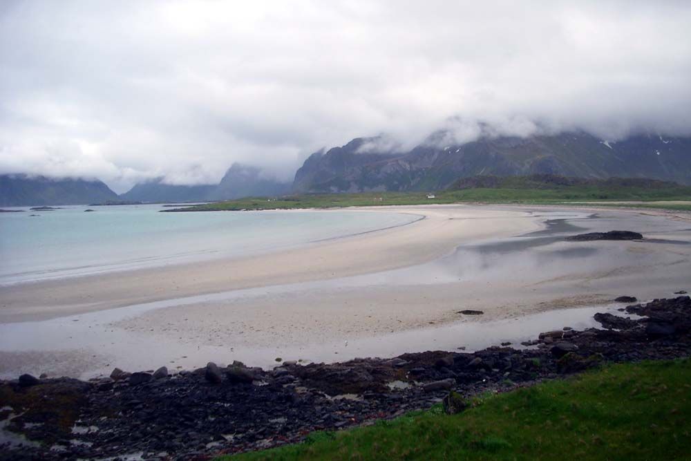 Leider ist das Wetter immer noch etwas nieselig und in Laukvic sind auch keine Menschen zu sehen, sodass wir auf der E10 entlang eines Ausläufers des Vestfjordes und anschließend über die imposante Gimsoystraumen bru weiter nach Gimsoy rollen. Weiter auf der E10 nach Flakstadt. Am dortigen Strand gab es dann genug Möglichkeiten zum Toben mit unseren Vierbeinern, bevor wir über die Kubholmenleia bru zu unserem Schlafplatz am Ryten rollen.