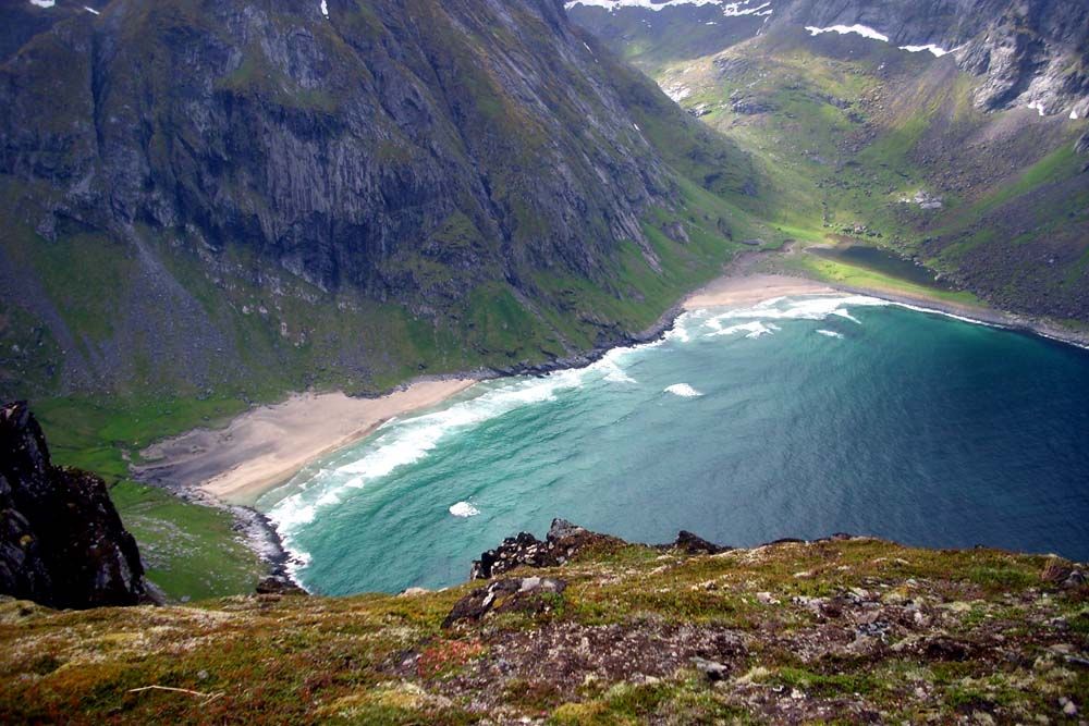 Kvalvika - in jedem Reiseführer beschrieben - ist ein wunderschöner Sandstrand in einer Bucht, das Wasser von grün in blau übergehend, Südseefeeling kommt auf. Man darf nur nicht an die Wassertemperatur denken - die mit vielleicht 8°C doch sehr von der Südsee abweicht... Und noch eine Besonderheit: Kvalvika ist nur zu Fuß über die vorgelagerten Berge zu erreichen.