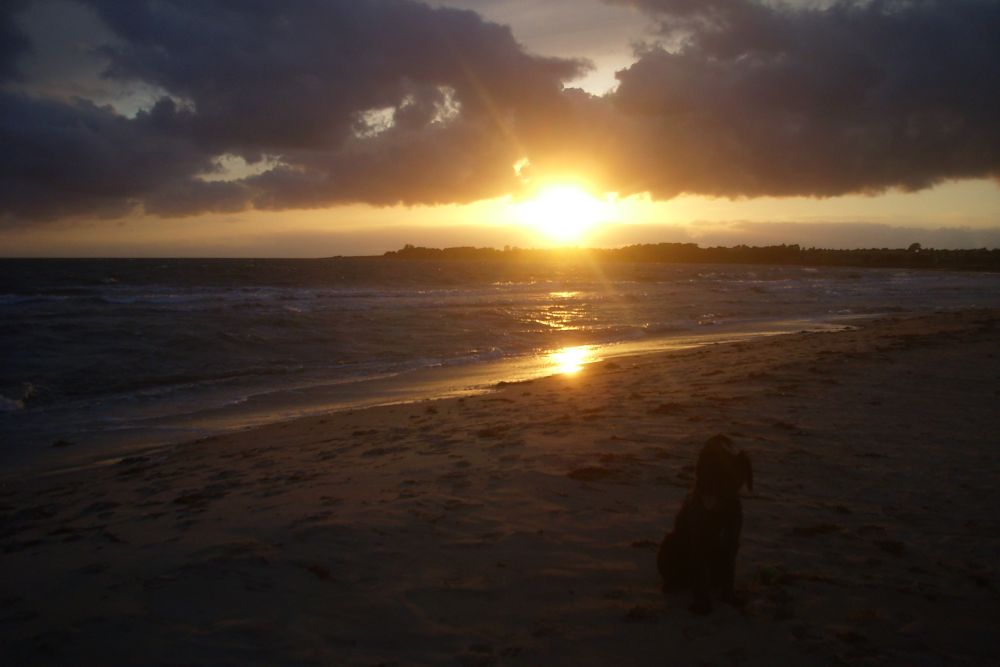 Nach dem Abendbrot gehen wir nochmals an den Strand, abends sind dort immer noch 13 Grad und die Sonne steht am blauen Himmel.