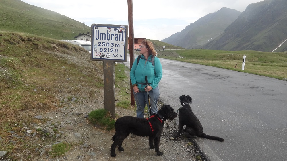 Wir wollen in Richtung Bormio, die Straße ist noch wegen dem Steinschlag vom Vortag gesperrt - also parken wir am Umbrail-Pass und wandern entlang des Berghanges. Links abschüssiges Wiesengelände, rechts ansteigendes Wiesengelände und beidseitig viele Murmeltiere, sodass unsere Vierbeiner an der Leine bleiben müssen. Der Weg führt uns mal breit entlang von Bergwiesen, mal schmal über Geröll, mal gibt es stark ausgewaschene Lehmabschnitte, mal geht es durch Wasserstellen. Und wir sind - abgesehen von Wildgetier - mutterseelenallein in den Bergen unterwegs. Allerdings wird nach ca einer Stunde der Nebel immer dichter und lässt keinen Blick mehr ins Tal zu, auch wird es immer dunkler und fängt an zu nieseln, sodass wir beschließen, den Rückweg anzutreten.