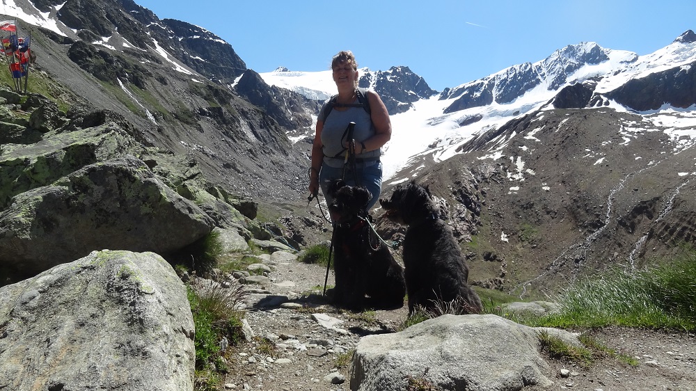 Wieder unten angekommen stürzen wir uns ins Getümmel. Mittlerweile sind auf dem Stilfser Joch jede Menge Menschen unterwegs, für Radfahrer ist das Befahren des Jochs das Highlight - auch für Motorradfahrer sind die vielen Serpentinen spektakulär. Autos, Wohnmobile und Menschen, Menschen, Menschen. Wir gehen auf der alten, für den Kfz-Verkehr gesperrten Passstraße mit den Hunden spazieren, hören und sehen Murmeltiere im Hang und laufen dann zum Alpengasthof Tibet, von welchem aus wir die Serpentinen gut beobachten können. Die Sonne strahlt vom Himmel und wir haben 17°C.