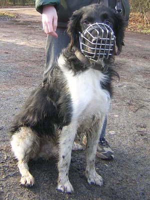 Und dann durfte er auch wieder aus seinem Zwinger, allerdings nur noch mit Gitter am Kopf. Schon beim zweiten Spaziergang fing er