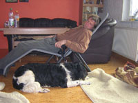 Dann holt er mich doch wieder in seine Wohnhütte zurück. Ok, dann leg ich mich eben neben seinen Stuhl..